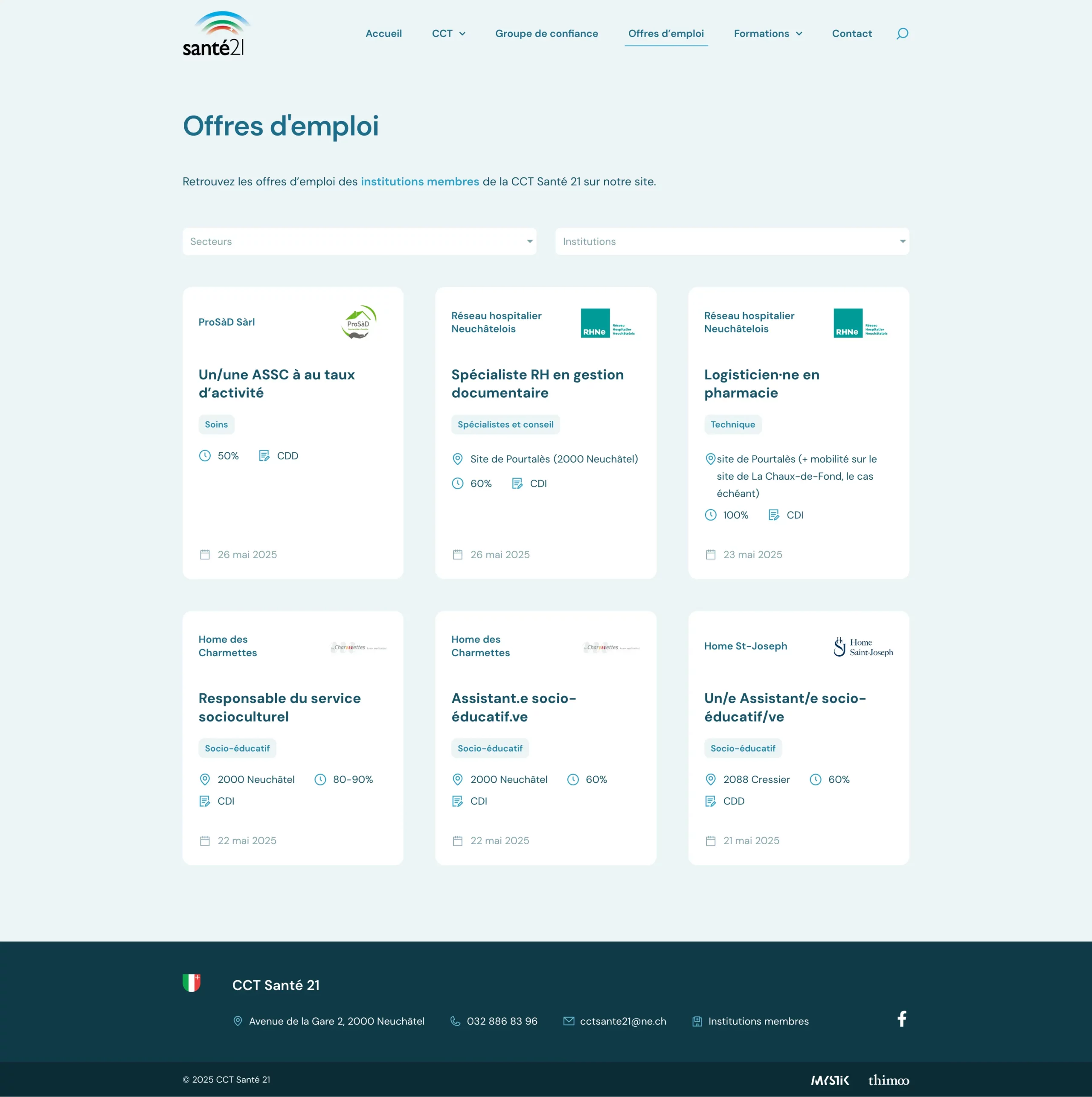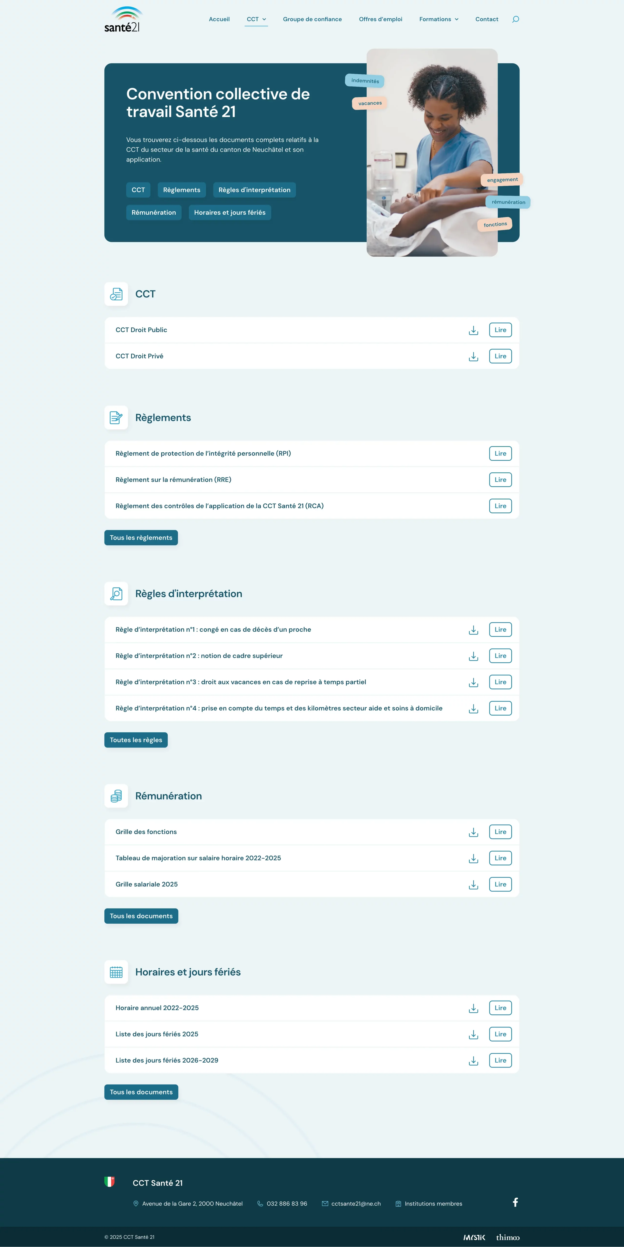 La CCT Santé 21, convention collective de travail du secteur de la santé dans le canton de Neuchâtel, a fait appel à Mystik (qui a réalisé sa superbe vidéo anniversaire) et à Thimoo pour la refonte complète de son site internet.